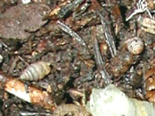 日本で最初にタヌキノショクダイが発見されたときは,陸貝を探していて偶然発見されたということがわかった。今回,タヌキノショクダイのことを調べていると,「タヌキノショクダイの生えている所には,赤い貝がおるんでよ。」と村の人が教えてくれた。実際に写真のように陸貝がいたので(右下の白いものがタヌキノショクダイ),生育(生息)条件に,何かの関係があるのではないかと予想される。 |