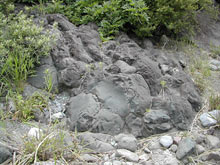 また,今回は紹介できなかったが,枕状溶岩の露頭(右の写真)の観察や,姶良火山から飛んできた火山灰の観察など,地質の調査も行った。