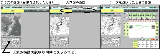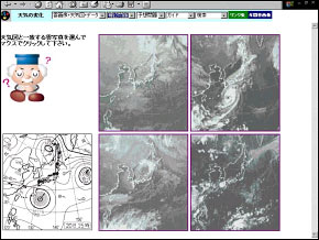 | 2) | 各気象現象において,雲写真,天気図,雲写真・天気図(両方を重ねて表示したもの)を選択することができる。
