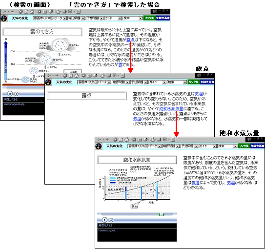 | 1) | 検索は,気象に関する現象や用語を文章・写真・動画で簡潔に表示した。気軽に思い出したり確認するためのものである。教科書,資料集やほかの資料などと併用していっても効果的であると考えた。 |