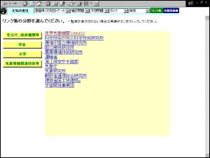 リンク集は,最新の気象情報を得たり,学習を深めたい時に,インターネットに手軽に接続できるようにした。リンク集は,官公庁・政府機関等,学会,大学,気象情報関連団体等の各分野から選択できる。
