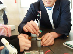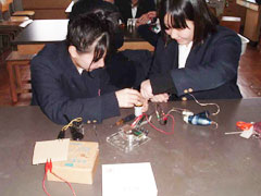 1.はじめに 1分野の最終単元「科学技術と人間」は,1分野の学習の締め括りとして,科学技術と人間生活との関連について考えていく単元である。2分野では,「自然と人間」という大きな括りの最終単元の中で,それまでの学習をもとにして,たくさんの問題を提起をしている。どちらも総合的な単元である。これらの単元で学習することは,重要な内容であるにもかかわらず,これまで時期的,時間的な問題から,軽い扱いで終わってしまうことが多かった。最近の入試問題でもこれらの内容は出題されるが,まだまだ軽くしか扱われていないようである。 そこで,この単元のねらいにあった学習を展開できる教材を考えた。 2.教材について 実験・観察が少ない単元である。知識としては学べるが,実感がわいてこない,変化の時間(歴史的な内容など),尺度が長いなどの理由から,できるだけ話題性がある実験などで学習できないかと考えてきた。最近の自動車業界をとりあげて,ガソリン車・ディーゼル車→ハイブリッドカー→電気自動車→燃料電池車という流れをつくりながら,「なぜ今燃料電池を開発しているのか。」「その原理はどうなのか。」「今までになぜ出来ていないのか。」など問題を投げかけながら進めた。内容が濃すぎるので適当に簡略化しながら生徒の反応を見ながら,『その原理ならできそう。』『今話題の燃料電池を作ってしまおう。』と製作に取りかかった。 なお生徒は,直前の単元「物質の変化とエネルギー」で,酸化と化学エネルギーの変換を学習しており,その学習が生かせる教材でもある。 ![]()