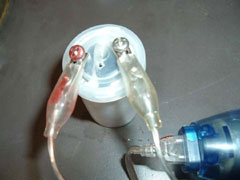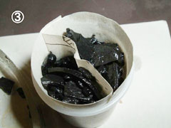 実際に気体の酸素と水素を容器に入れ,導線で結んでも電流は流れない(この点が研究課題である。理科室などでも実験は可能であるが,触媒を使うなど手軽ではない)。いろいろな方法が教材として研究されているが,いかに簡単で生徒にわかりやすくするかが問題である。教材化するために,竹串の炭素化,鉛筆を使う方法,シャーペンの芯などいろいろ試作してみたが,扱いやすさ,強度,経済性,生徒の作業能力などから結局電極はステンレスねじとし,活性炭に埋め込む方法を使った。活性炭は,水槽の浄化用の,しかも使い古した物を洗って使用した。 3.製作方法 授業では,口頭で指示していく。