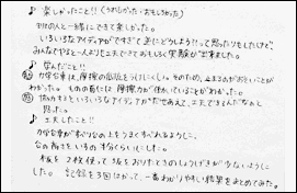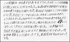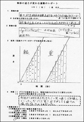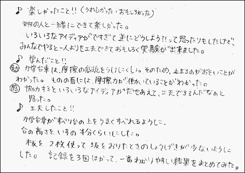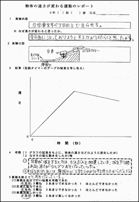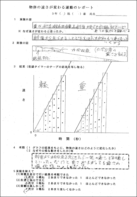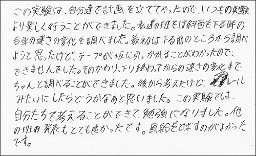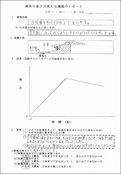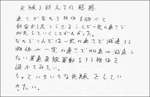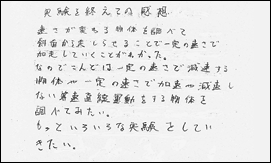 | 【知識】・ | 実験上の発見,工夫,苦労,楽しかったこと,協力できたこと,頑張ったこと,速さが変わるために必要なこと,次にやってみたいこと,等についてまとめておく。 |