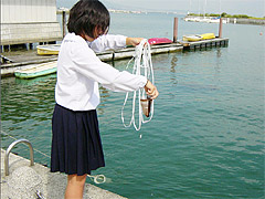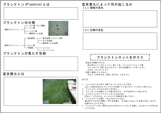| 琵琶湖には,約500種以上のプランクトンが棲んでいて,魚の餌になっている。しかし,琵琶湖の富栄養化にともない,アオコや淡水赤潮といった好ましくない現象が起こってきた。そこで,自作プランクトンネットを作ってプランクトンを採集して顕微鏡で観察したり,透明度や各種の物質の濃度を測定したりして,湖の生態系を理解させることをねらいとして野外活動を行う。 |