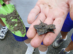 雨降りでスタートした古琵琶湖層調査であったが,積極的にぬかるんだ露頭に近づき,体操服を汚しながら一生懸命観察している生徒たちの様子が印象的であった。生徒の感想には,「昔の琵琶湖の地層が,こんな山奥にあるのに驚いた」とか,「比叡山の花崗岩が風化して砂のようになっているのはすごい」とか,「ヒシの実の化石がとれてよかった」というものが多かった。「たくさん歩いたけれど,もっとまわってみたい」という感想も多かった。