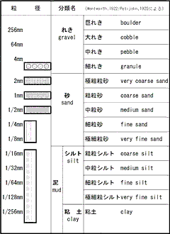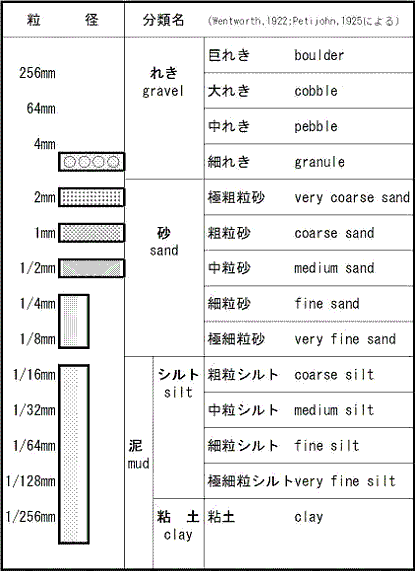 また,地層の観察を行うために,生徒一人ひとりに実物粒度階区分表(右図)をつくらせ,地層を構成する粒子の粒径の違いに注目さるようにした。これによって,砂の単層が何千枚も連続して堆積し続けてきた時間の長さを想像させたり,粘土を主とする単層から砂を主とする単層というように大きく変化した層理面では,河口の移動や急激な水位の変化などの大変動が起こったことに気づかせることができる。