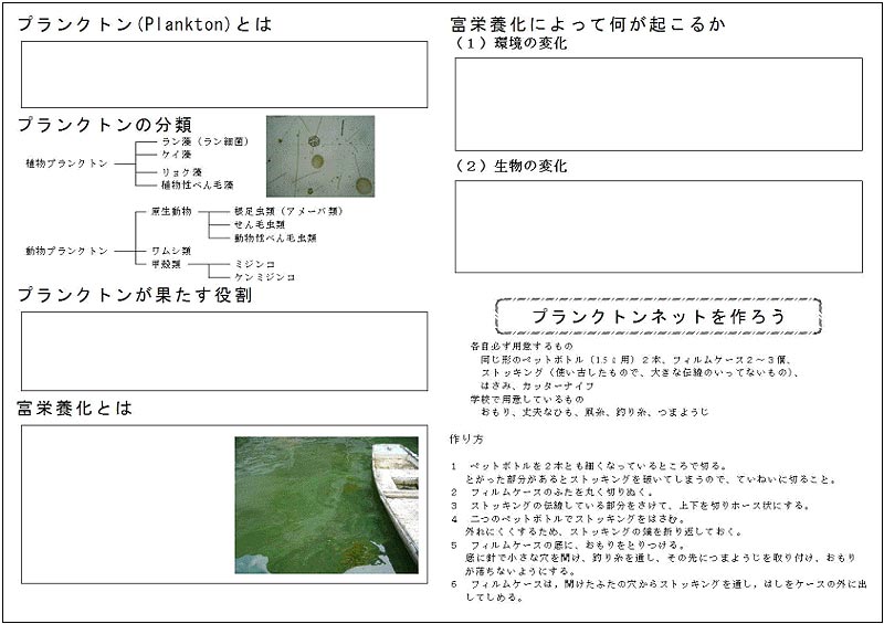自作のプランクトンネットは,身近な材料を用いて製作させた。大型のプランクトン(カイミジンコやオオヒゲマワリなど)の採取には十分実用的なものである。採水させたものは,緑色のスープのようであった。