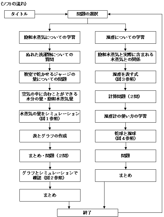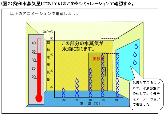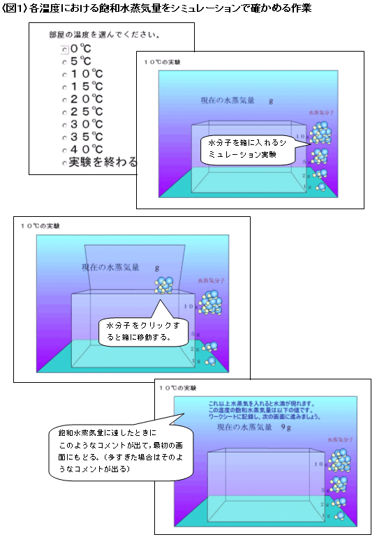 空気中に含まれる水蒸気の量や飽和水蒸気量について考えさせるときに,図解による説明よりも,「水蒸気の量とはこういうものだ」と視覚的な体感をする方が効果的である。この考えを基にして,コンピュータによるシミュレーションの手法を用いると効果的に学習内容が定着するのではないかと考えた。本ソフト制作の目的は,アニメーションの鑑賞やマウスでクリックすることにより,飽和水蒸気量や湿度についての関心を抱いてもらい,理解の深化を促すところにある。