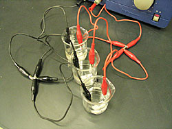 3つの抵抗を含む直列回路と並列回路で,抵抗を水に浸けて発熱量を調べる。