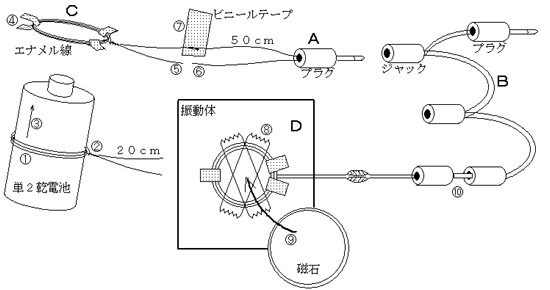 できる限り強力なものを見つけることが重要です。ネオジウム磁石は入手しやすいものの中では最適ですが高価すぎるので,筆者はホワイトボード貼付用磁石のうちで比較的強力なもの(クラウン社のカラーマグタッチCR−MG50,直径5cm丸形)を探しました。演示用には音量が必要なので,ネオジウム磁石が必要です。 |