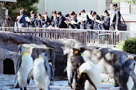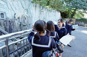 生徒は午前9時15分に上野動物園正門前に集合し,30分開門と同時に入園し,総合案内所裏の広場で再び集合。そこで動物解説委員の萩埜恵子さんを紹介し,萩埜さんから本日の動物観察についてのポイントを指摘していただいた後,時間差をおいてクラスごとに班単位で出発。出発前に動物解説委員から「私たちは有名なパンダの姿をよく知っているし,思い浮かべることもできると思っているけれど,色や形・模様を本当に正しく知っているでしょうか。例えば,パンダの目の周りは黒いけど,その他に黒いところはどこか分かる?。実際はどうなのか観察して確かめてみてください。見たつもりになっているが,実際の姿や行動を意外と見落としている場合が多いものです。動物のしぐさや行動が,意外と私たちと似ていることもあり,面白いことが発見できるかもしれません。動物の気持ちになってじっくり時間をかけて観察してみてください。」ということで,生徒は班単位で選択したコース・必修コースの動物のところへ移動して動物の観察を開始する。ワークシートに沿ってチェックする各班の生徒の表情は真剣そのものである。