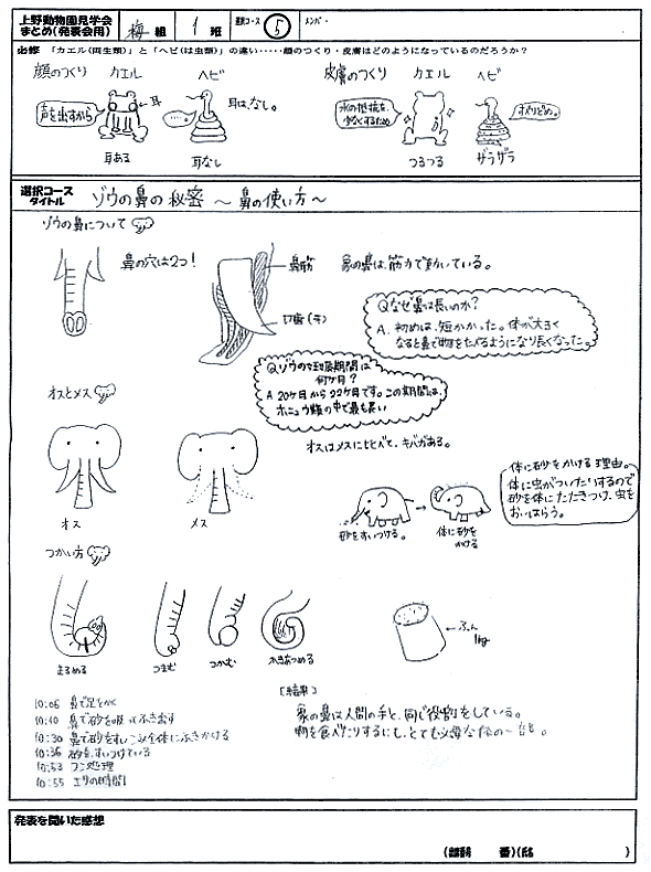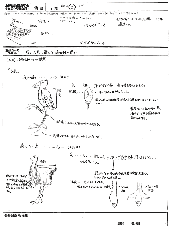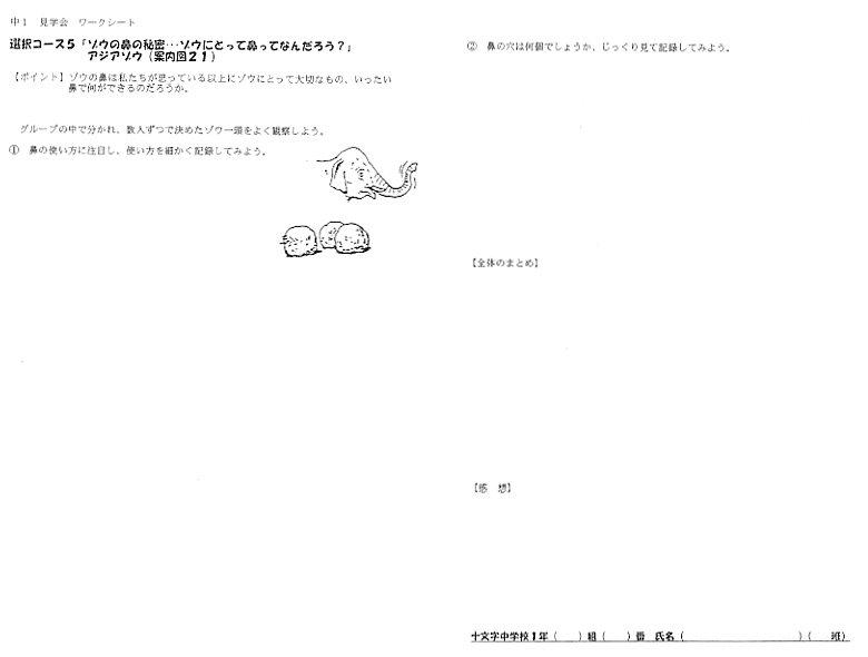 | 1) | 当日それぞれの選択コースのワークシートに,観察した内容やスケッチを記入して提出すること,その際,先生方も動物解説委員の方も質問した内容の答えは教えないがヒントになることはいいますので,自分でしっかり考えて答えを出してほしい。 |