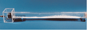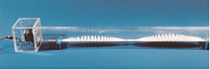 1866年,ドイツのクント(1839〜1894)は,長さ1メートル,直径3〜4センチメートルのガラス管(クント管)を水平に置き,その中にコルク砕片などの粉末を散布したものにピストンをつけた棒を挿入し,棒に振動を与えた。その結果粉末に生じる変化により,ガラス管内中の音速を測定した。 |
