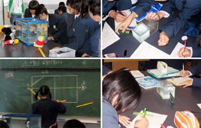 実験結果の発表の場面では,棒の磁石を使って光の進み方を確認したが,水面(ガラス面)での屈折の様子までとらえていた生徒が少なかったので,「この場合はどちらに屈折するのか」をみんなで考え,側面や正面で全反射していることも確認できた。 まとめの場面では,再び「見える,見えない」理由を考えたが,どのように説明すれば良いのかが分からない生徒が多かった。「見えることは」「見えないということは」を問いかけながら,実験で確かめた結果をもとに文章にしたり,発言する生徒がでてきた。みんなで考えることで,どう説明して良いか分からなかった生徒も自分なりの文章でまとめることができた。 4.成果と課題 身近で不思議な現象を取り上げることで,生徒が「なぜ」という疑問を持ち,「知りたい」という解決に向けた欲求を喚起できる。本実践では,光の様々な現象を取り上げたが,どれも生徒にとって興味深く,解決に向けた意欲的な活動が見られた。そして,授業展開や実験教具を工夫することで,より「できる・わかる」につながり,基礎基本の力が身についていくと考えられる。 しかし,意欲的に活動しながらも,「わからない・できない」とつまづきをかかえる生徒もいる。授業後にワークシートを評価したり,評価テストをしてみるとそれが明らかになってくる。その様子をとらえ,授業中や授業後に個別の支援をどのように行うかが大切である。また,既習事項や観察実験結果をうまく使い,科学的に考えることは難しい。基礎的な知識技能を持っていることも必要であるが,いかに結びつけて考えられるかということも,今後の実践の中で課題としていきたいと考えている。 |