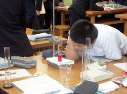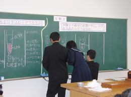 4.成果と課題 ロウの密度を求めたとき,水と灯油の中間のデータとなる。そのデータが生徒に示されたときは,0.8台の密度を示さないと予想しにくいのではないかと心配したが,生徒は0.9台を示しても,すんなりと予想していた。純粋なデータから,本当にそんなマンガのようなことが起こるのか半信半疑になりながら,様々な予想を立てた。もう少し時間があれば,もっと色々考えただろうと思う。当初のねらい通り,生徒の科学的思考を高められた授業になった。