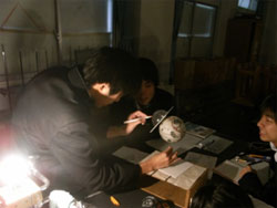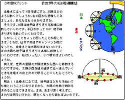 今回の実践では,太陽と地球の大きさの違いを10億分の1のサイズで考えさせあと,豆電球で作ったオリオン座をモデルに遠い星と近い星を見分けることができるかどうかを考えさせた。子どもたちは,1.3cmかない地球に驚き,150mも離れた地球にそのスケールの大きさを感じ,天球という距離を無視した考え方ができることが確認できたようであった。 次に,地球から見た太陽の一日の動きを観察させた後,アース君を用いて地球外からの視点での確認をさせた。その際,実際の日の出の方角をもとに,アース君で同じように日の出を見ることを考えさせ,地球の自転の向きの意識付けも行った。アース君での実験と実際の観察とで同じ結果がでたことで,生徒は視点の切り替えのこつをつかめたようであった。 視点の切り替えにさらに慣れさせるために,世界各地の太陽の動きについて考えさせる授業を組み込んだ。生徒には,まずは天球上で予想させ,そのあとアース君を使って確認させた。生徒の予想では,天の子午線上での太陽の通過位置はバラバラであったが,世界のどこでも東から西へという動きについてはおおむね揃っていた。このことからも,生徒が予想をするときに,地球外からの視点を大切にできるようになったことが分かった。 公転や地軸の傾きについては,天体の視運動をもとに,アース君を使って自分たちで試行錯誤させながら,地球の実運動へと結び付けさせるようにした。今回,初めての実践であったが,生徒自らが試行錯誤を繰り返すなかで視点の切り替えを何度も行うので,視点の切り替えがスムーズに行えるようになったと考えられる。 しかし,アース君での実験を行っているときに,「地球からはどう見えているの?」という質問をするような生徒も見られたので,アース君に小型のwebカメラを取り付け,リアルタイムで視点の切り替えが行えるようにするなど,改良を続けていき,子どもたちが天体の学習にのめりこめるような環境を目指していきたい。 |