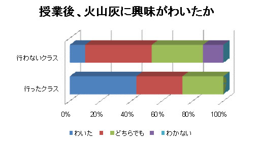 この授業を行ったクラスと行わなかったクラスで,識別に自信がある造岩鉱物をあげさせた。どちらのクラスでも,長石,黒雲母の名称をあげた生徒が多かった。鉱物の数を比較すると,行ったクラスの方が2倍以上多いという結果であった。また,火山灰への興味の深まりにおいても,両者に違いが見られた。(図6)