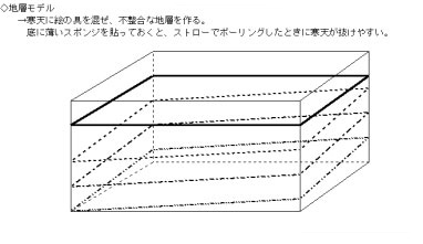 寒天による地層の不整合モデルの内部のようすを想像することにより,自然の地下の地層の広がりを想像できる。 |