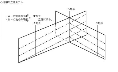 柱状図から,地層の立体モデル(注:9.参考資料参照)を作成し,他班への取材をワークシート3−2に記入する。 |