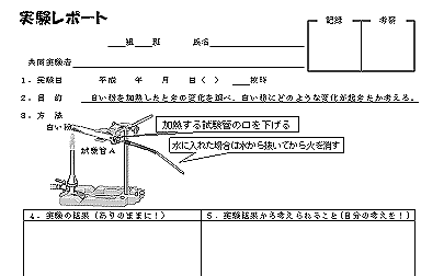 この時間の一番のねらいは「白い粉を加熱したときにどのようなことが起きるのか」をじっくりと観察させることである。目の前で起きる現象をよく見て記録すること,そこからわかること,考えられること,疑問等を自分の言葉で表現することもねらいのひとつとしてレポートの作成を行った。粉の名前や事前に何が起きるかは一切説明せず,ガラス管の先を水に入れさせて(300ccビーカーを使用)実験を行った。