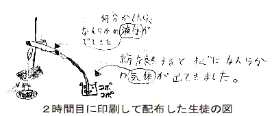 次の時間は,図を使って記録した生徒のレポートを裏面に印刷してから返却した。それをもとに,見られた現象の確認とレポートの評価の観点を伝えることから始めた。