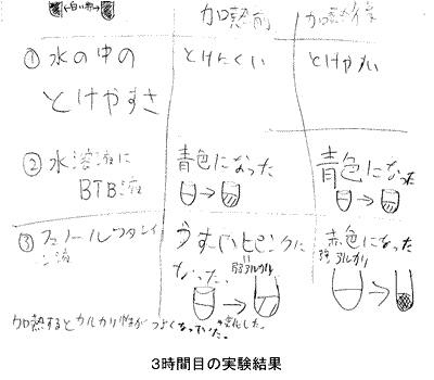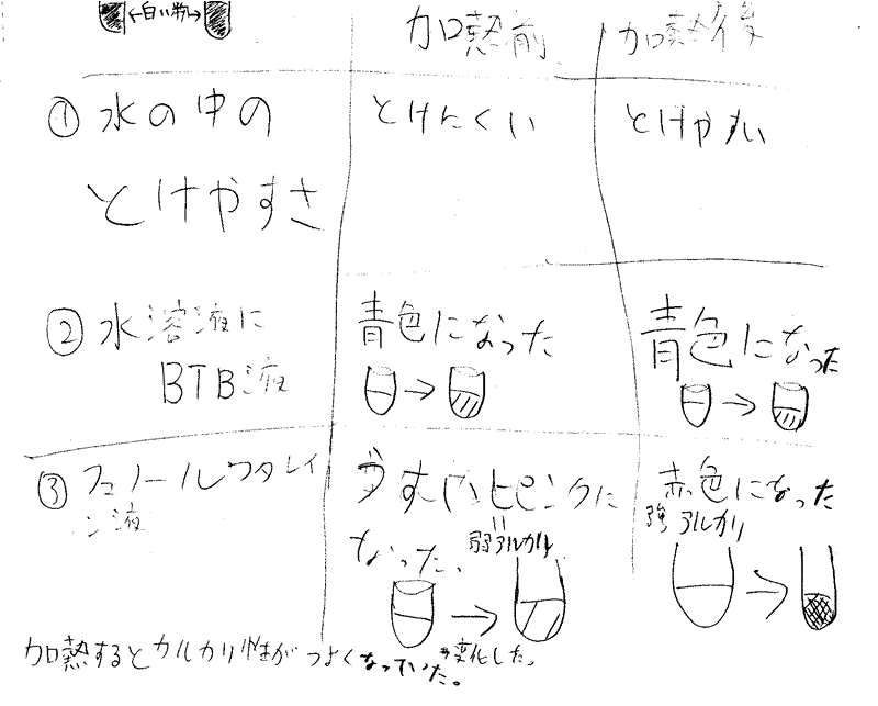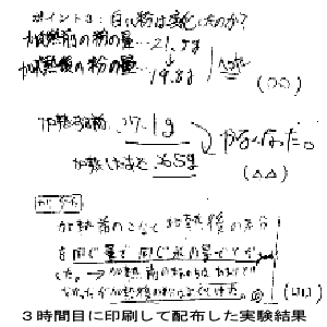 最後の10分程度で実験全体のまとめを行ったが,ここでは白い粉を加熱することにより3つの物質に分かれたことを押さえるにとどめた。「白い粉」の正体については次の時間に知らせた。