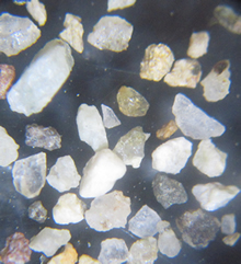 ☆火山灰に含まれる鉱物と砂に含まれる鉱物を比較して観察することで,それらの成因がマグマに由来することを見いだすことができる。 ○山形県で産出する海岸砂,川砂,山砂などを準備する。 ☆火山灰や海岸の砂,川砂などに含まれる鉱物を,ルーペなどを用いて観察し,鉱物を分類することができる。 ○砂を構成する鉱物を有色鉱物と無色鉱物に分け,もととなった火成岩を推定させる。 |