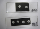 スライドガラスに両面テープをはり,パンチで穴を開けた黒い台紙を置く。真ん中に目的とする鉱物をはりつける。