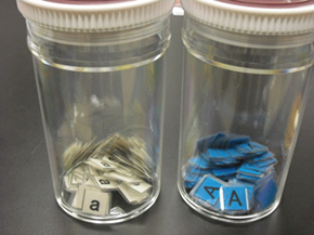 これをモデルを使って実験し,その結果がメンデルの法則から予想される理論通りになるか,本校生徒120名(後に示すデータは80人分)を4人ずつのグループに分けてデータを集めてみた。