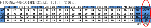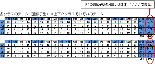 F1の遺伝子型の分離比は,ほぼ25%ずつの1:1:1:1であった。さらに,同時に出した4枚のカードから表現型も記録して集計をしてみたところ次の表のようになった。
