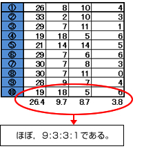 また,それぞれの班は48回で,一見たくさんのデータを取ったように感じるが,「表現型の分離比データ」の表を見ると9:3:3:1の理想に遠い班もある。しかし,48回×10班の480回のデータでみると9:3:3:1に近い分離比が出ている。データを増やすことでより理想値に近づくことができた。