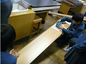 ・協力して実験を行うことができる。<4人一組> ②運動が変わらないときには,力は働いていない。また,力がつりあっているときには,力は加わっていないということを理解する。 ③力がなくなると止まるのではなくて,力が働くから止まるという事を理解できる。 ④力が働き続けるとどんどん速くなるということが理解できる。 |