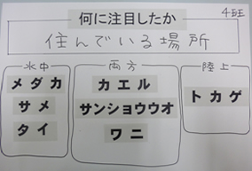 BDグループ(ワニ,トカゲ,カエル,サンショウウオ,サメ,メダカ,タイ)をさらに分類する。何に注目して分類するか班で考え,画用紙に書き,さらにその根拠をもとにDグループの動物を分類し,それぞれ画用紙に貼る。