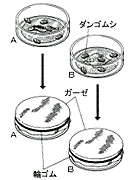 前時の学習で調べたように,本当にダンゴムシは枯れ葉しか食べないのか,という疑問を生徒は投げかけた。そこで右図のような装置を作り,ある実験を行ってみた。まず,2組のシャーレにダンゴムシを同数ずつ入れる。さらに1つは緑色の葉,1つは枯れ葉を入れる。そして数日間観察をするというものである。結果の予想としては,枯れ葉の方は食すが,緑色の方は食さないだろうということであった。
