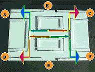 発泡スチロールで,左の図のような迷路を作成し,ダンゴムシを歩かせてみる。すると,一定の規則性があるということがわかった。それは,触覚の触れた方に曲がるという性質である。これは,ダンゴムシの生活場所が暗いところであることにも関連がある。つまり,