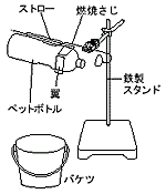 | ア | .燃焼さじの柄の部分を先にし,燃焼さじの皿の部分から4cmくらい上の部分を鉄製スタンドにはさみ,固定して発射台とする。 | |  |