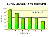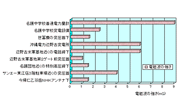 (4) 露頭の観察と調査 沖縄本島北部の本校から近い7カ所の露頭を紹介し,観察・調査した結果をレポートにして提出させている。配当時間は4時間で,オリエンテーション1時間,発表準備1時間,発表会2時間となっている。露頭とその特徴は下記の通り。 1) 名護市瀬嵩・・・しゅう曲 2) 名護市後原・・・貫入岩と海岸段丘 3) 名護市底仁屋・・・横臥しゅう曲 4) 本部町大堂・・・カルスト地形 5) 本部町備瀬崎・・・不整合とビーチ・ロック 6) 本部町大石原・・・アンモナイト化石 7) 本部町崎本部・・・フズリナ化石 (5) 環境調査 本年度も下記の5つのテーマの中から1つ選び,調査結果をレポートにまとめて提出する。配当時間は課題説明の1時間のみ。 1) 名護市内の空気の汚れ調査 2) 川の生物による水質調査 3) 酸性雨の調査 4) 電磁波の調査 5) 紫外線の調査 <生徒のレポートの一部>(電磁波調査のデータ)