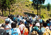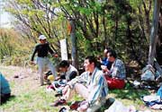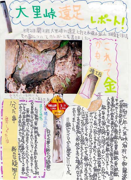 開校から約1か月経った5月2日、学校から約30km離れた山形県境の「大里峠」へ、遠足を実施しました。 遠足といっても、親睦やレクリェーション的な活動ではなく、テーマに基づく研修活動を中心とした巡検で、本校の「総合的な学習の時間」のテーマ『いわふね・村上学』の一つに位置付けた活動でした。