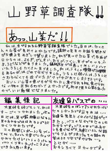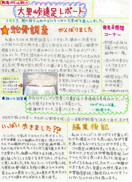 4.成果と今後の課題 本校は新潟県北部の十数市町村から生徒が通学する、広い地域を学区とした学校です。 今回の活動は、体験の中で自然や人に関わる活動を中心に据えましたが、このような、地域の「本物」を体験することによって、言葉ではなく体で「いわふね・村上学」の奥の深さや、体験活動・探究活動の大切さ、おもしろさを感じさせることができました。充実した個人レポートの様子や「今までで、一番楽しい遠足だった。」というような声が生徒から聞かれたことも成果の表れと考えています。 学校がスタートして、まだ1か月という早い時期での活動でしたが、生き生きした生徒の目に、これからの本校の進む方向を再確認することができました。これからも、こうした活動を通じて、生徒の目を地域から次第に日本あるいは世界へと向けさせ、6年間の計画的・継続的な教育の中で、骨太で真の学力を身に付けた人間を育成していきたいと考えています。