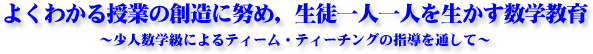 | ○ | 目標別型グループの指導において,「じっくり理解コース」は,数学が苦手な生徒が多くなる。そのとき,自分のペースでできることをよいと感じている生徒も多いが,劣等感を感じている生徒もいる。 |