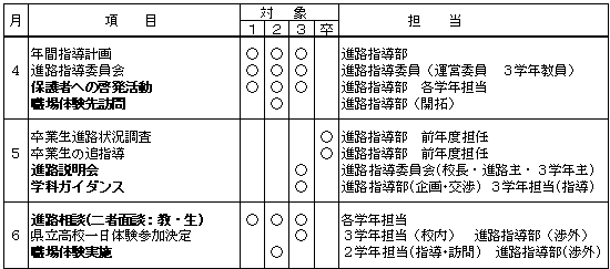 進路指導年間計画(表1参照)にあげられた項目すべてにわたって,進路指導主事が原案としての企画・立案に関わり,特に,担当欄の進路指導部とあるところは,進路指導主事が中心となる。