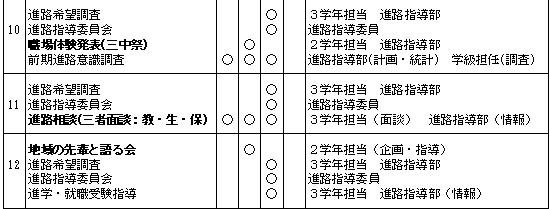 従来,3年生の入試に関わる事務は,3学年主任がすべてを取り仕切っていたが,主として生徒の指導に関わることを司り,高校との渉外に関わることは進路指導主事が窓口として一本化する。特に,私立高校からの推薦勧誘に関しては,適切な段階から進路指導主事がリードをとる。