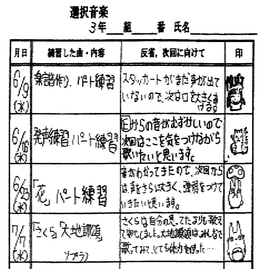 通信票への記述は,各自が努力したところ工夫したところ,身についた力などを個人内評価し,文章で表現する。それにより,生徒のやる気が引き出せると考える。本校では,6つの観点を設定し,その中でも,特に顕著な点を指導要録や通信票に記述している。