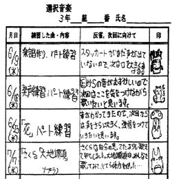 「総合」の時間の最後5分を使い,その日に行った活動・反省・自己評価,次回の予定などを簡単に書きとめる作業を行っている。そうすることによって,生徒が自分の活動状況を反省し,教師が生徒一人ひとりの活動状況を把握することができる。