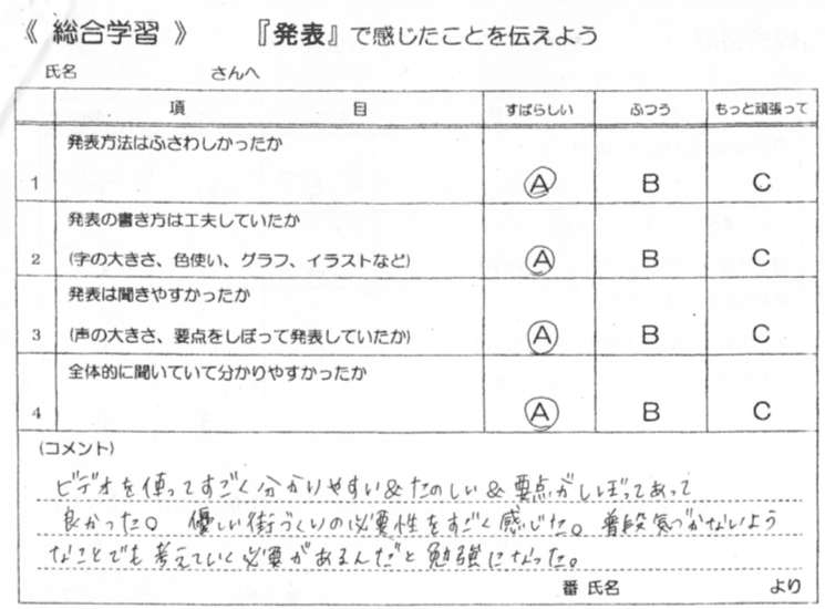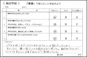 その後,自己評価を行う。各自は他の意見や評価を参考にし,自分の研を客観的に評価していく。さらに,次の「総合」の取り組みに対する意欲へとつなげていく。