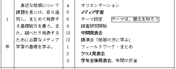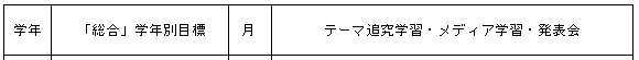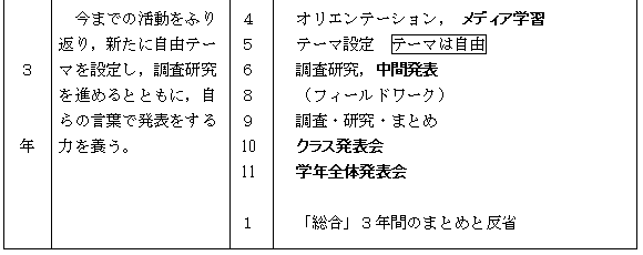 資料の集め方・まとめ方・発表の方法を修得するメディア学習は,「総合」を充実させ,わかりやすく説得力のある発表にするために必要なことである。本校では,3年間に次のようなメディア学習を行う。特に,1年生ではメディア学習に充分な時間をとり,その後の「総合」に活用できるようにしている。