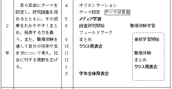 「総合」は個人によってテーマが違うため,一人ひとりに応じた指導が必要である。クラス単位で学級担任が指導していたものを,昨年度より少人数クラス,そして今年度より課題別クラスも実施して,個に応じた指導を行いやすくしている。