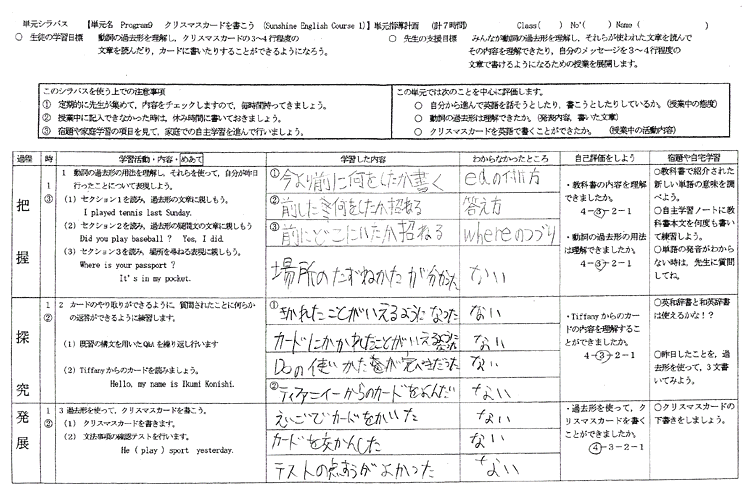 さらに,本年度は先に述べた「形成的評価」の方法として,「単元シラバス」(学習計画表)を単元の導入段で生徒に示すことにした。内容とねらう効果は次のことである。