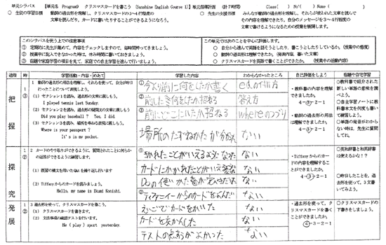 単元シラバスを配布しているため,生徒は本次ではどのような学習や活動を行うのか把握できた上で,授業に臨むことができている。授業では,実際に友達を紹介するためのモデルスピーチとして,3学年の生徒の友達紹介をビデオを通して聞く活動を行った。3学年の生徒は,授業を行う学級の生徒の兄弟姉妹を選出し,1学年の生徒にとっても親しみやすく,話題の提供になるよう配慮した。授業後,単元シラバスを回収し,生徒の記入内容をチェックしたところ,前回「わからない」と答えた生徒の中に「三人称単数現在形のSをつける場合とつけない場合の区別」がわかり始めた生徒がいることがわかった。
